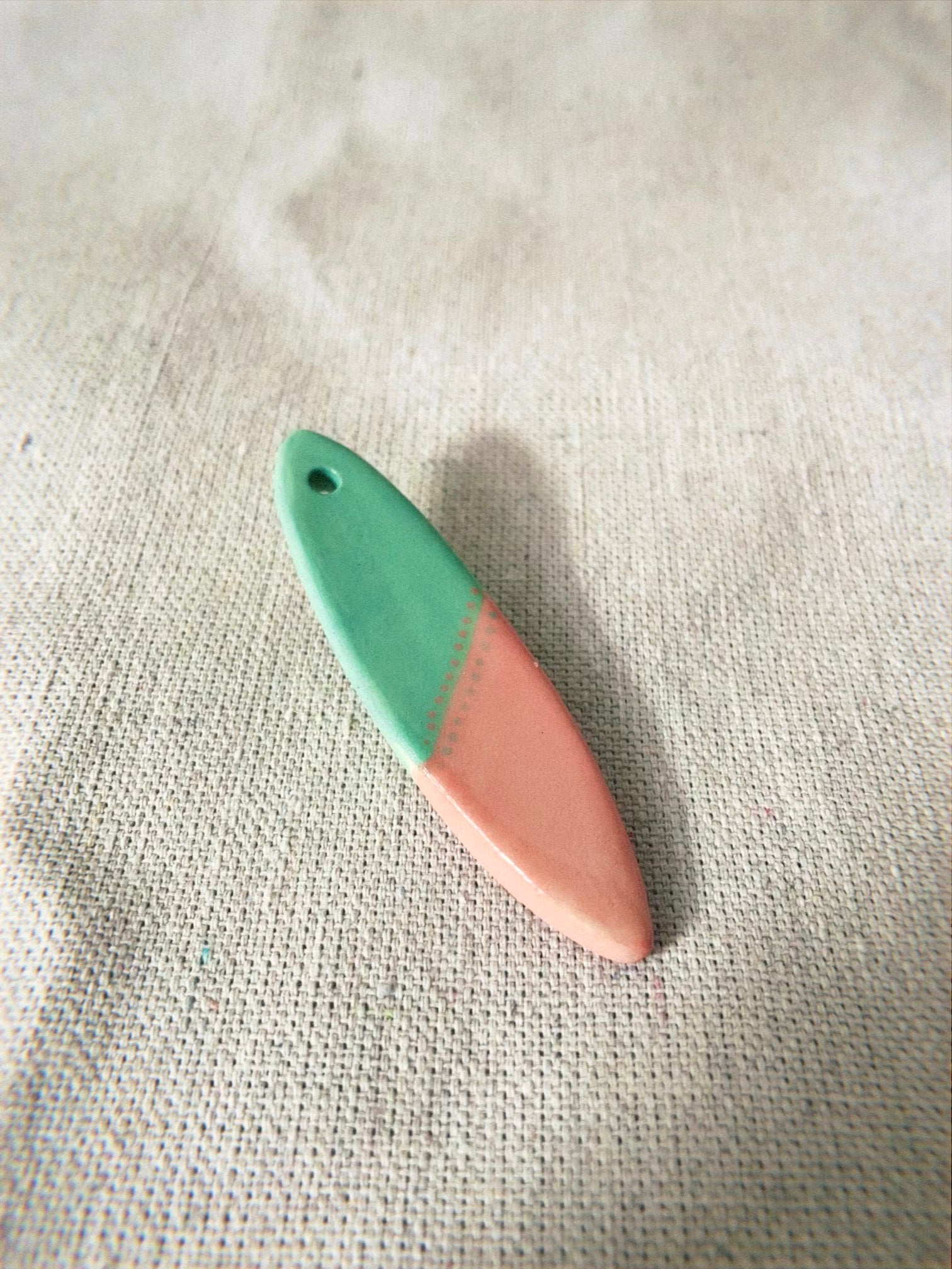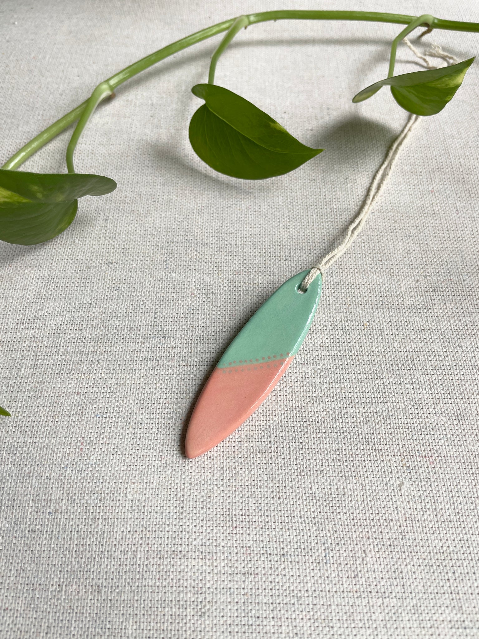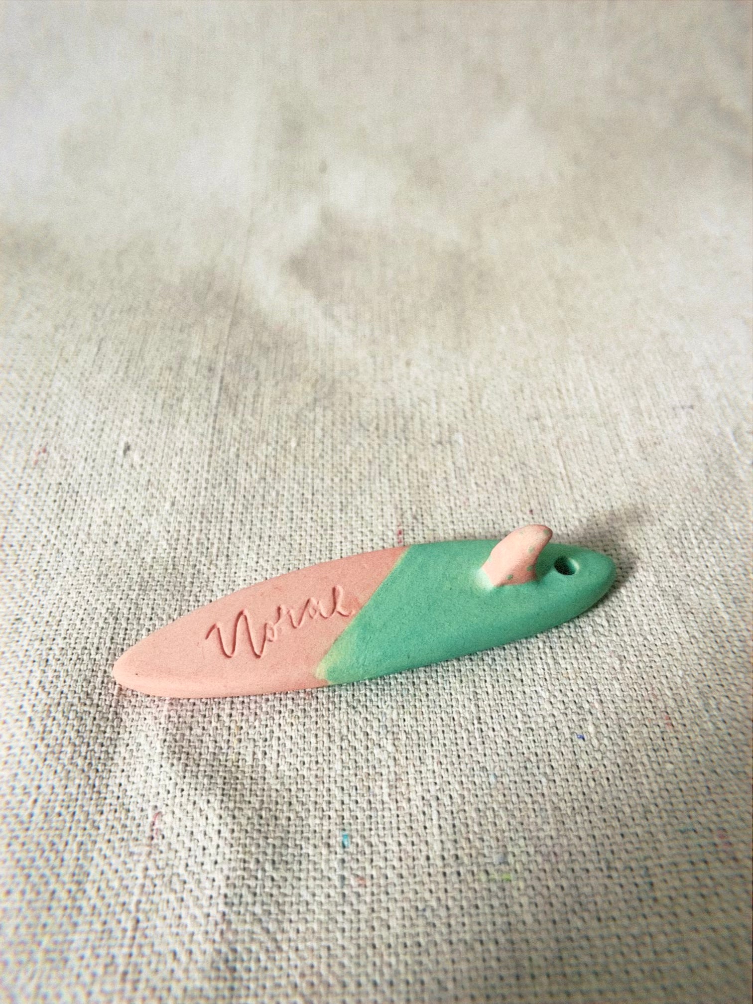 Mini ceramic surfboard sculpted with smooth white stoneware clay. Hand painted.