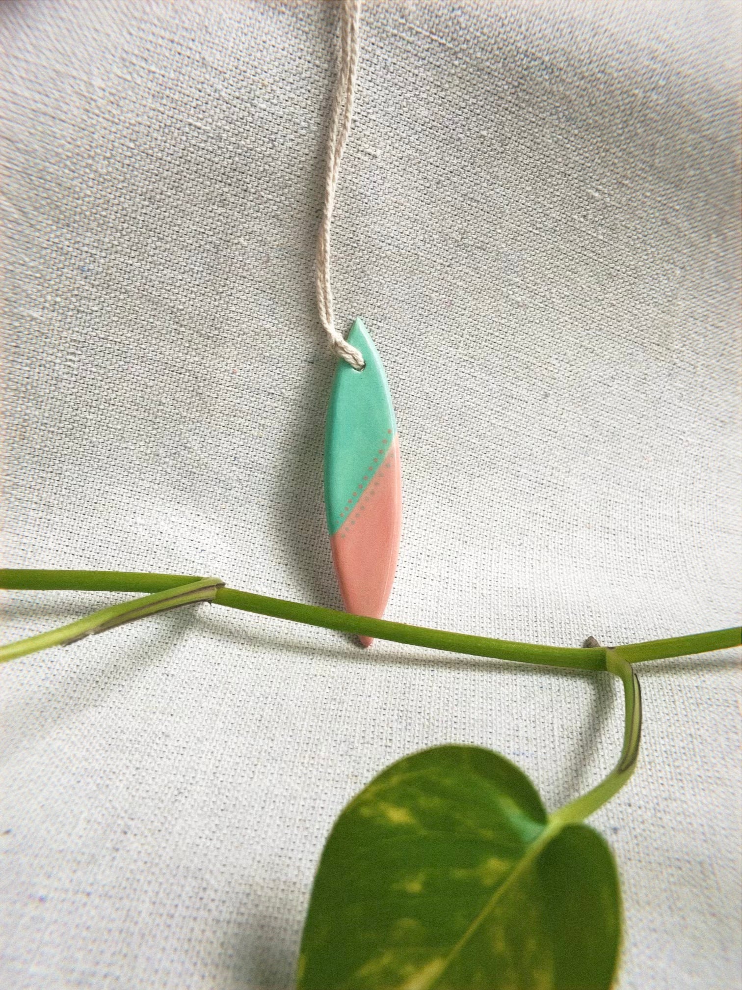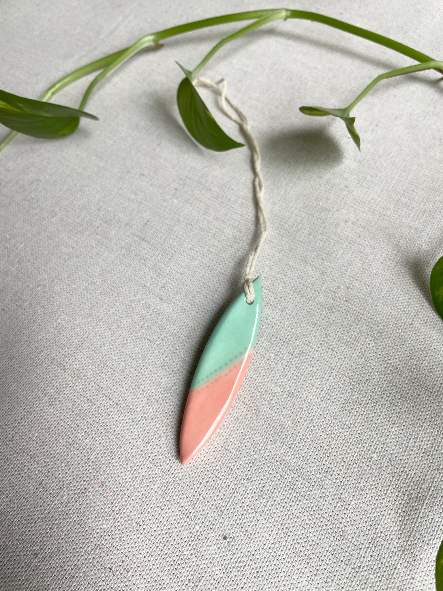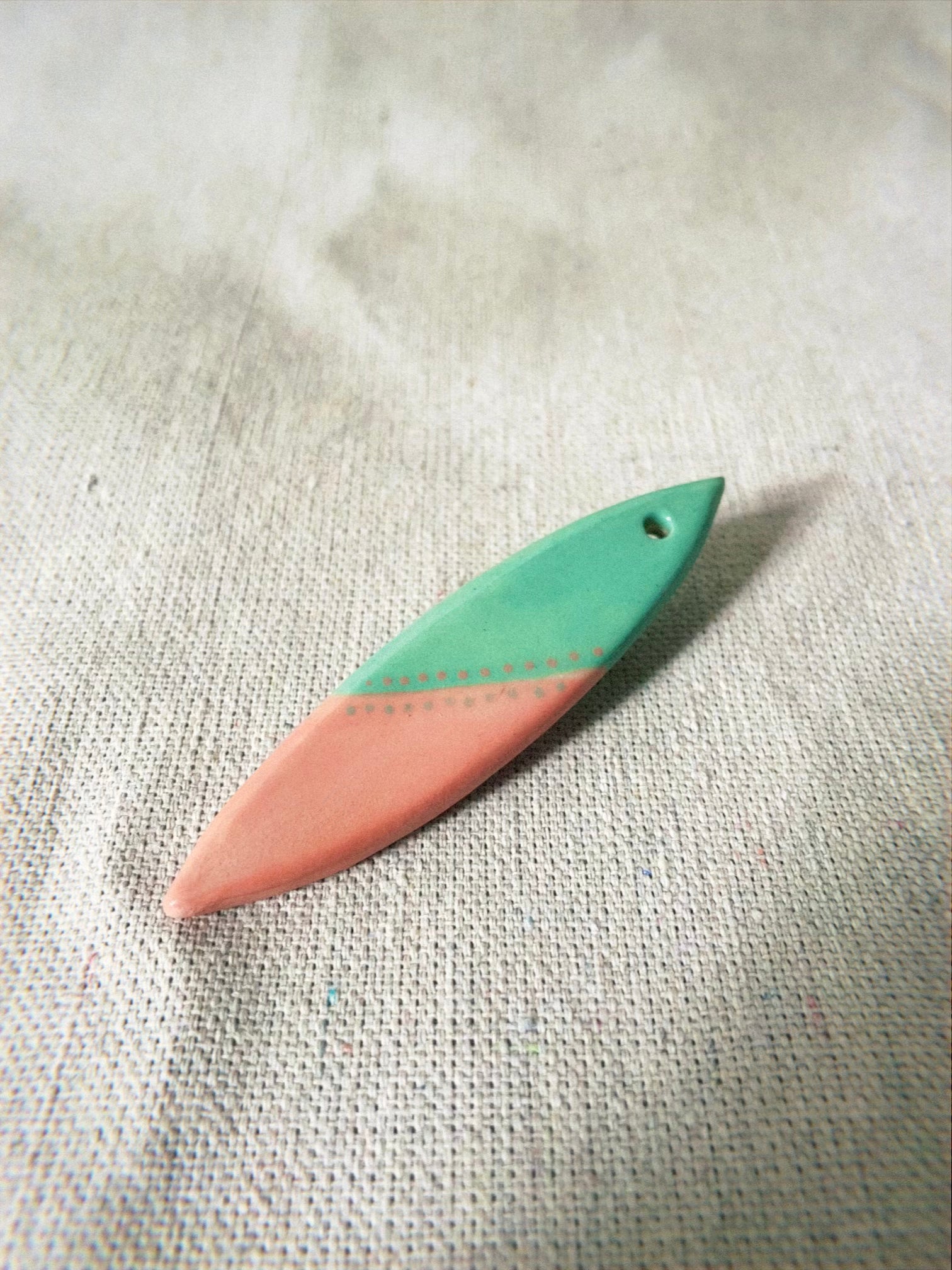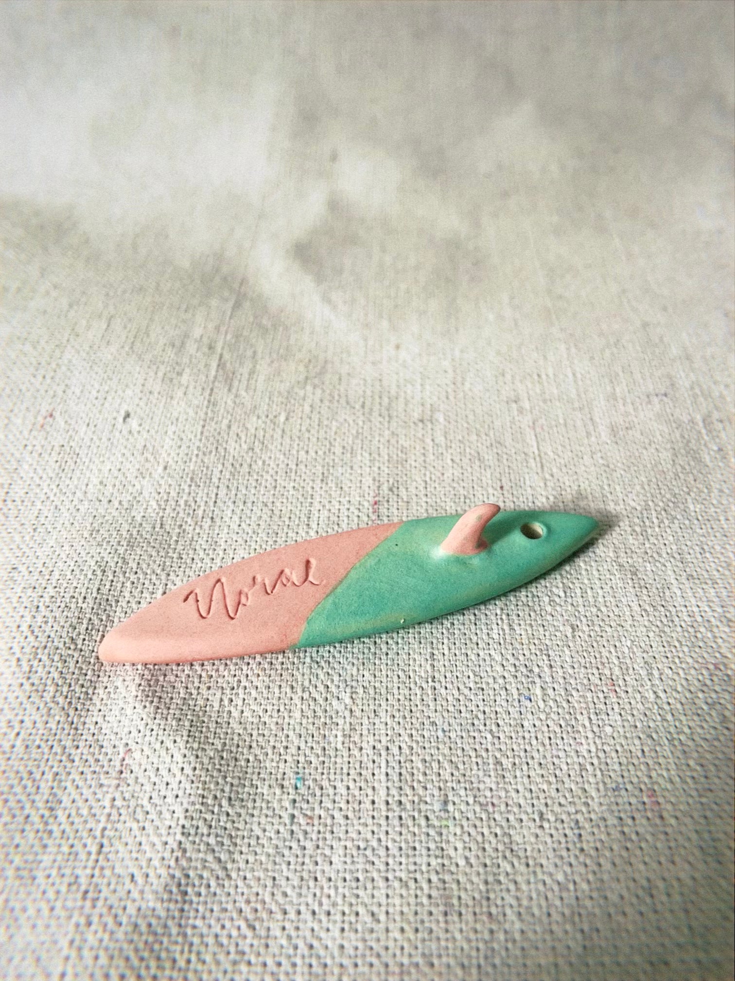 Mini ceramic surfboard sculpted with smooth white stoneware clay. Hand painted.