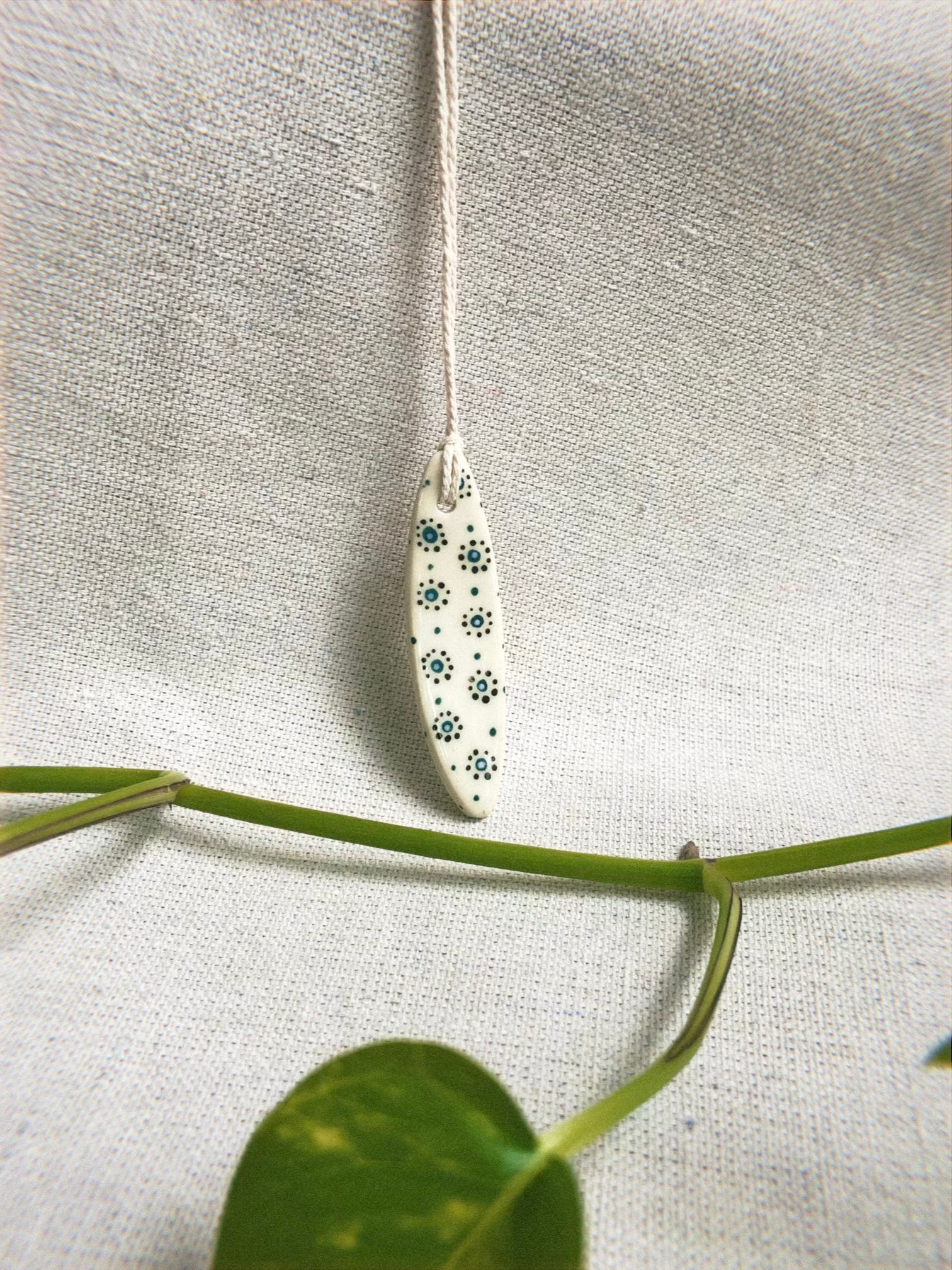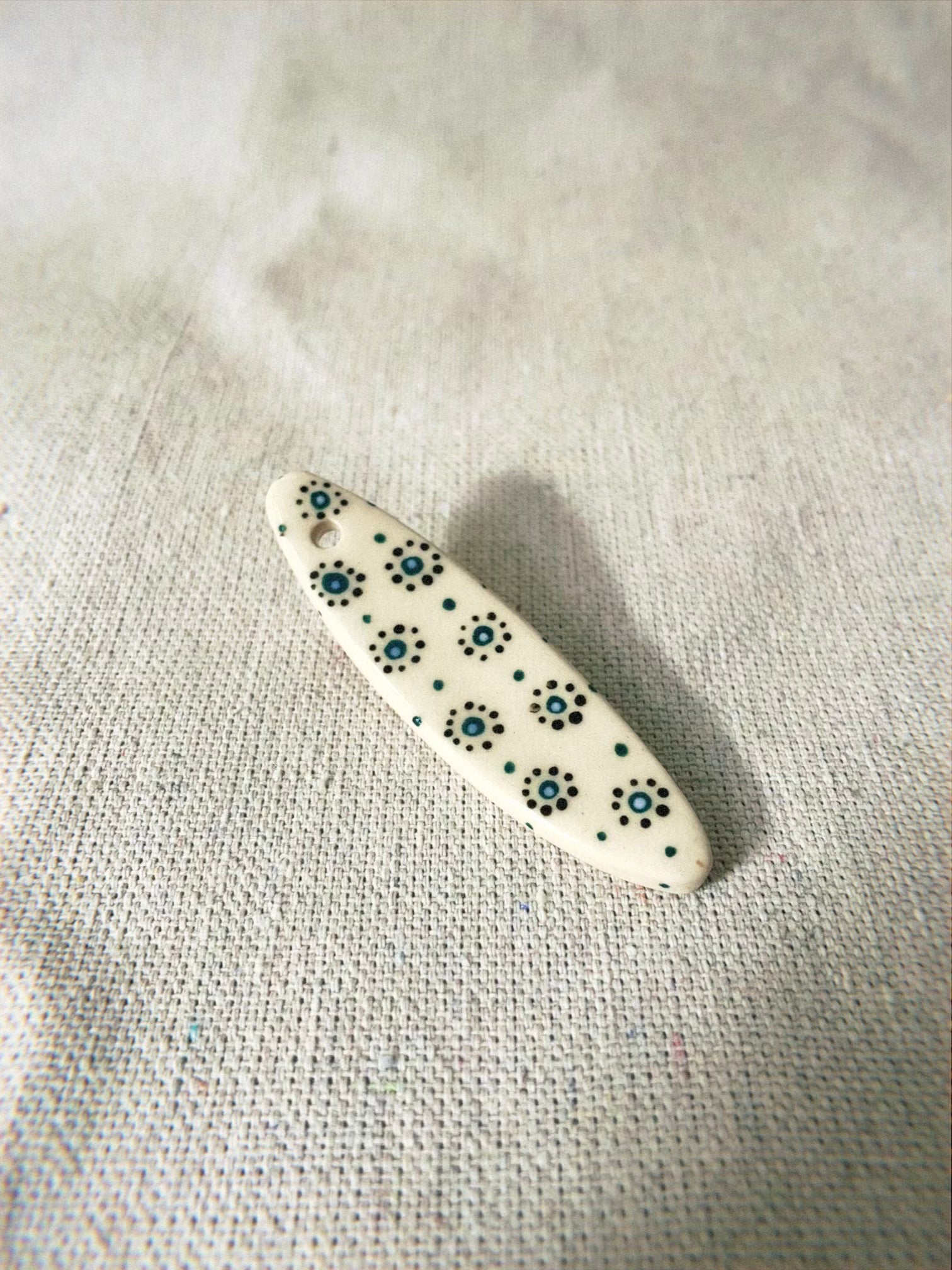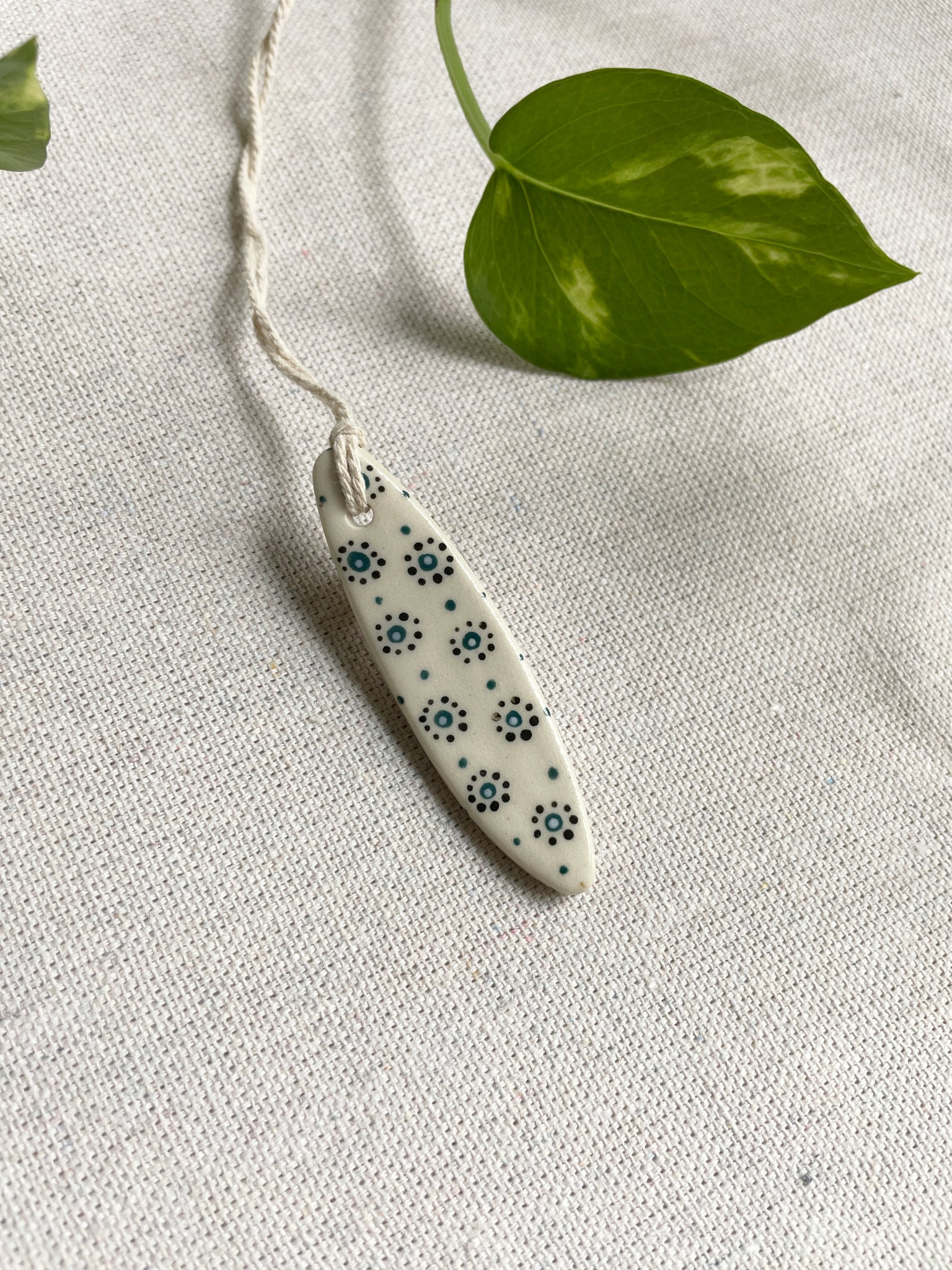 Mini ceramic surfboard sculpted with smooth white stoneware clay. Hand painted.
