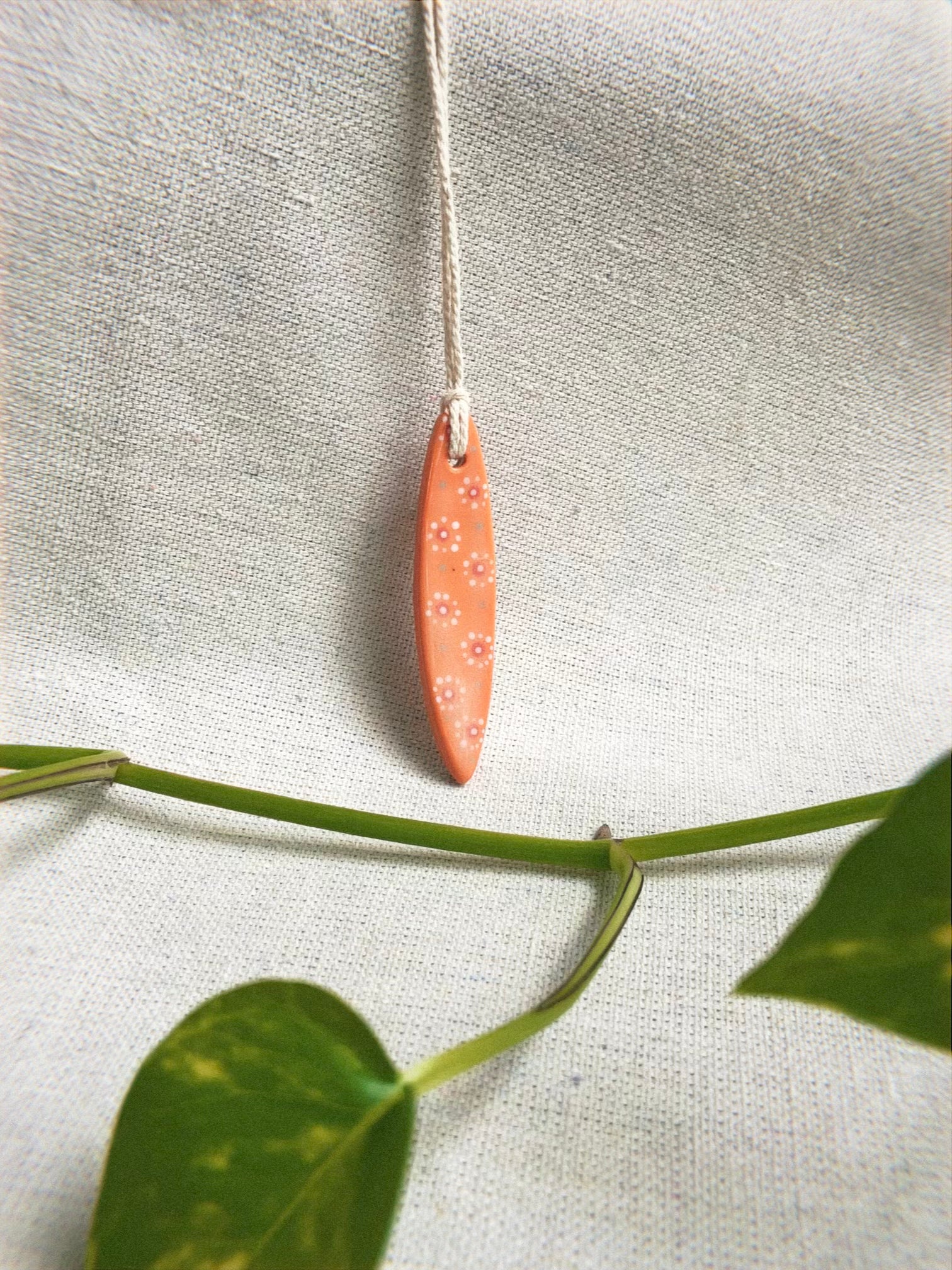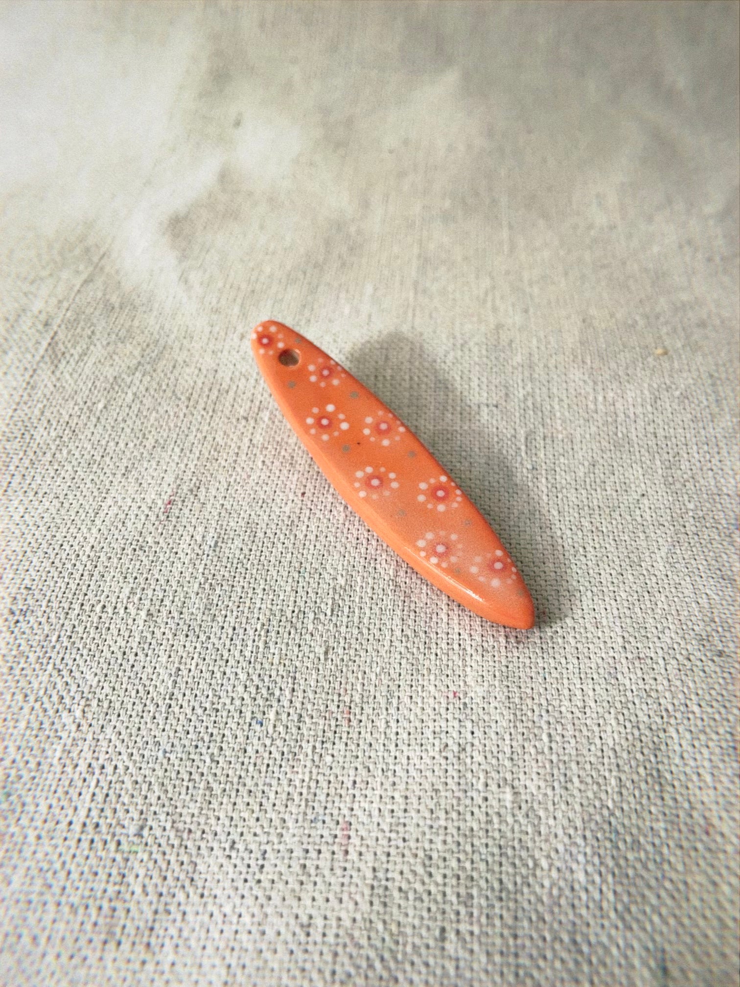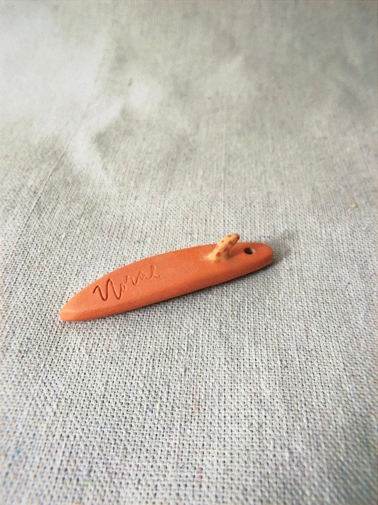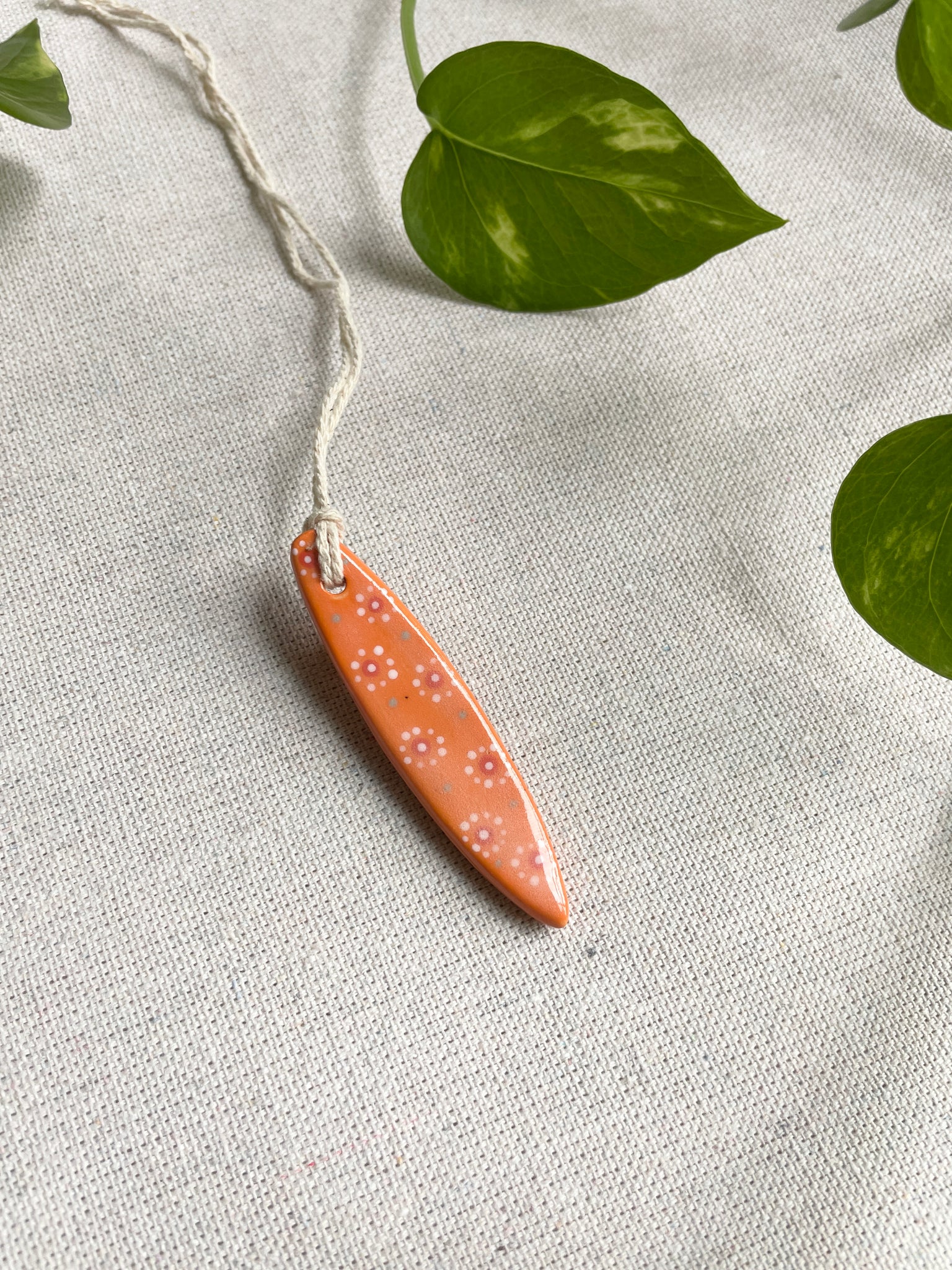 Mini ceramic surfboard sculpted with smooth white stoneware clay. Hand painted.