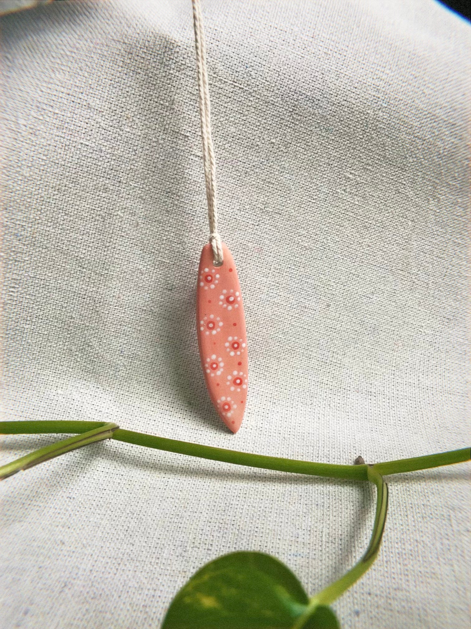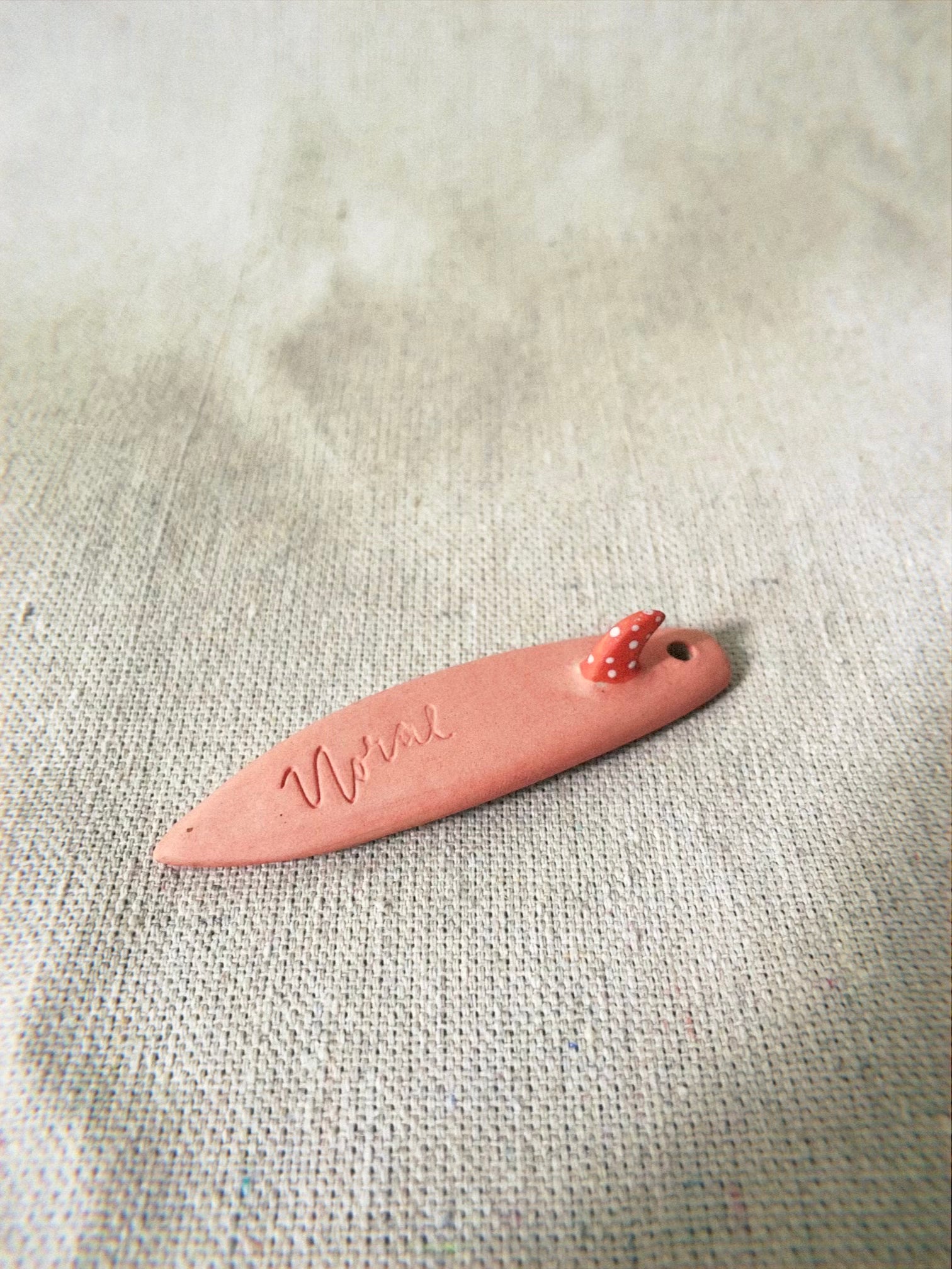 Mini ceramic surfboard sculpted with smooth white stoneware clay. Hand painted.