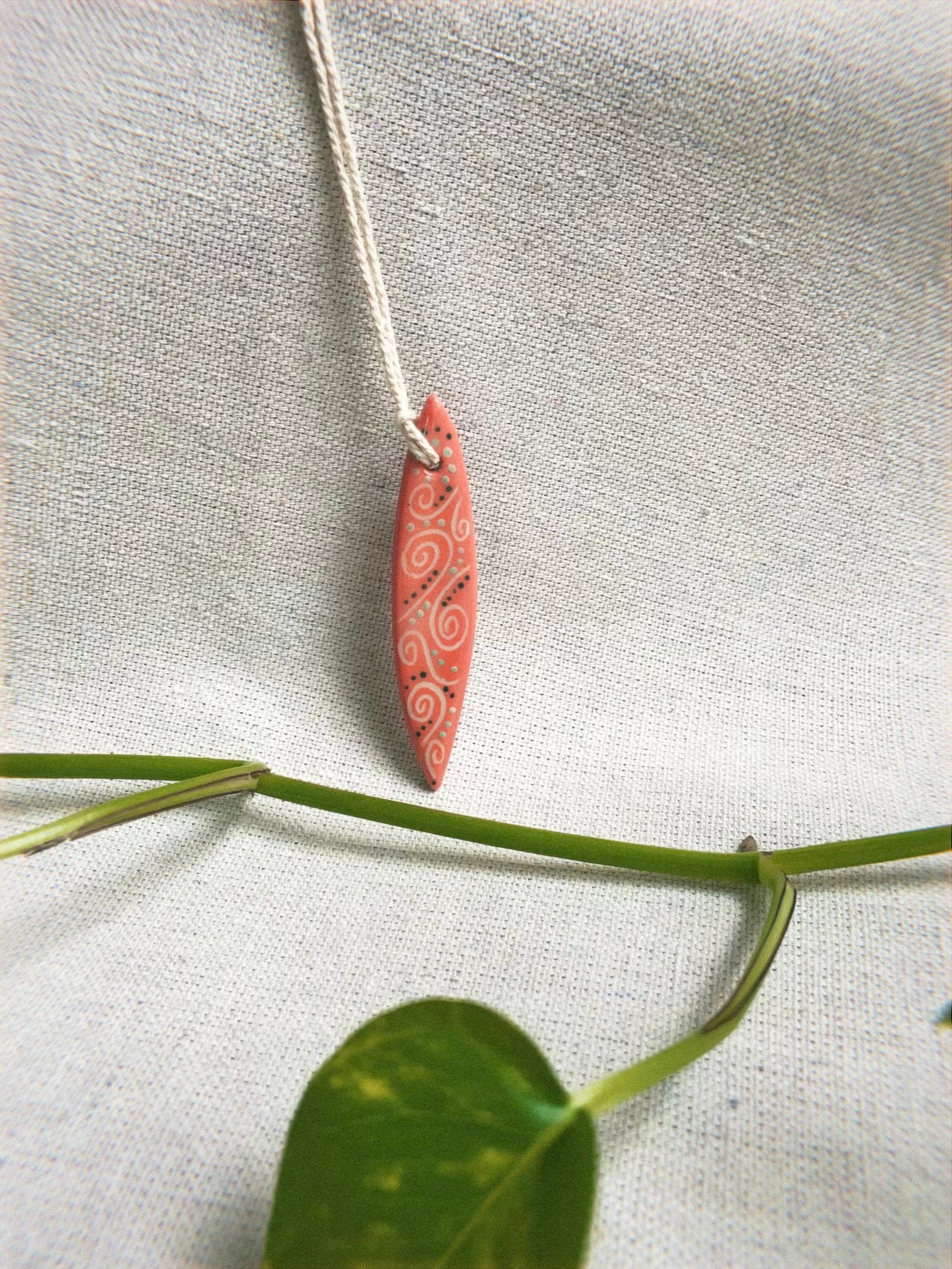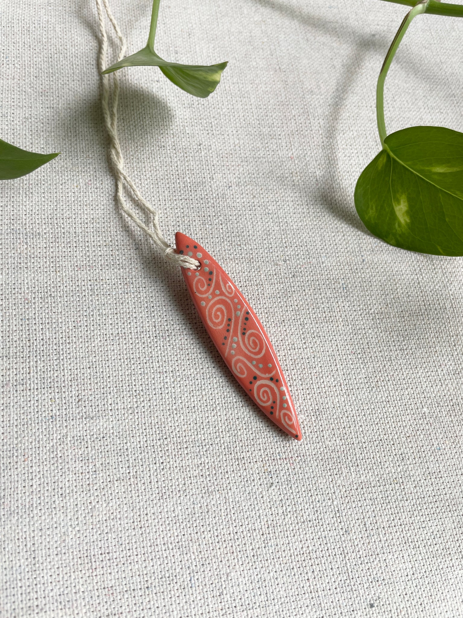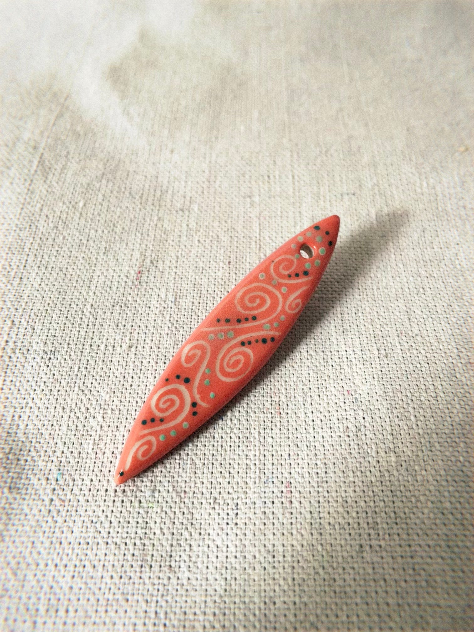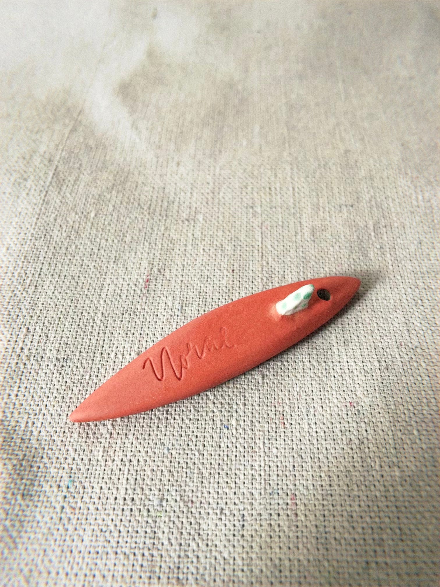 Mini ceramic surfboard sculpted with smooth white stoneware clay. Hand painted.